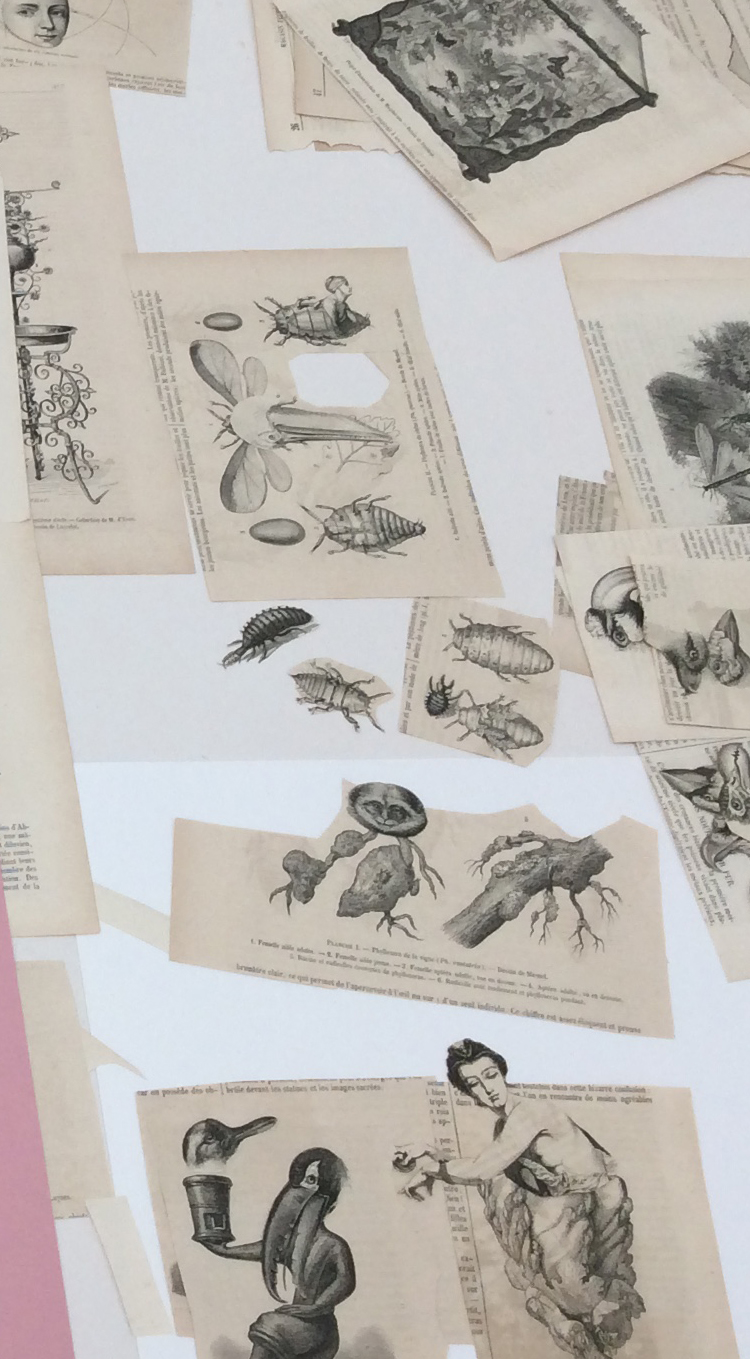 The material for the collages: wood engravings from 19th c. magazines. Studio, 2020